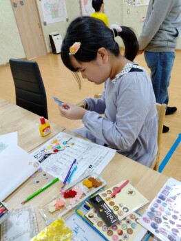 クリスマスツリーの型のオーナメントに絵を描いています。